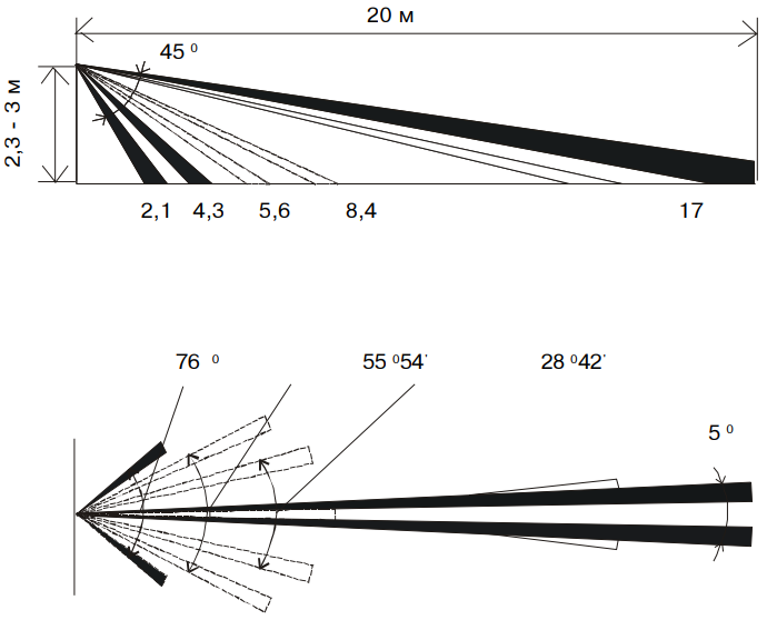 - 45* в вертикальной плоскости и 5* в горизонтальной плоскости на максимальной дальности для извещателя ИО209-8 "Фотон-6А";